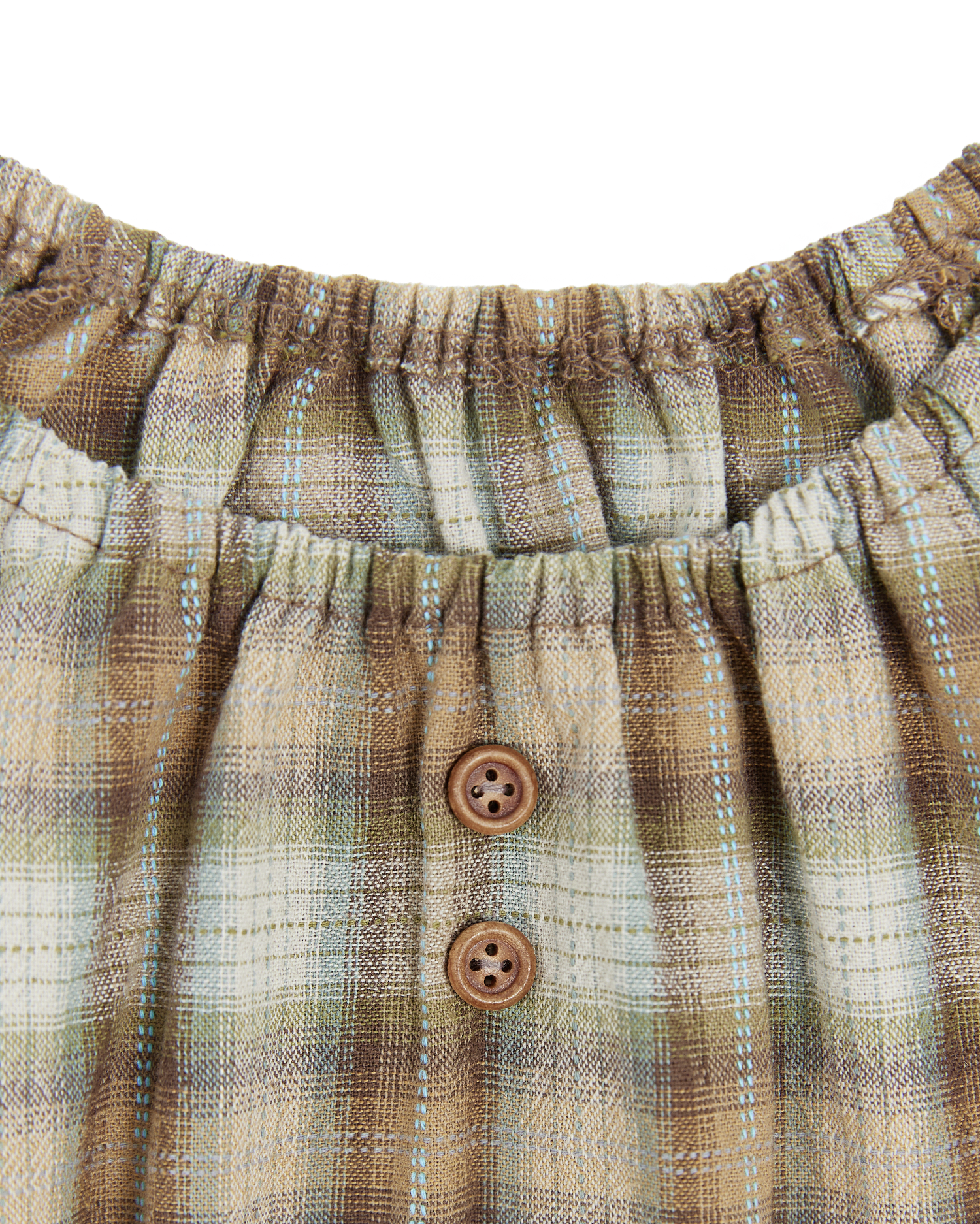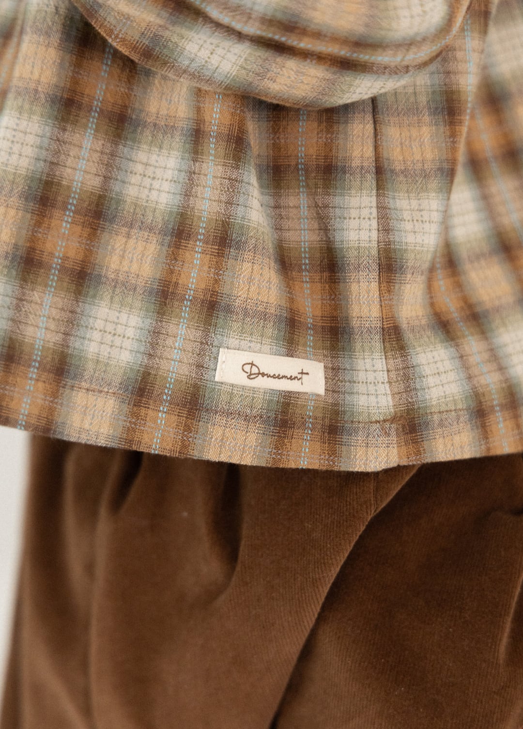 ブラウン・グリーン・ブルートーンが調和したヴィンテージ感のあるチェック生地に、
