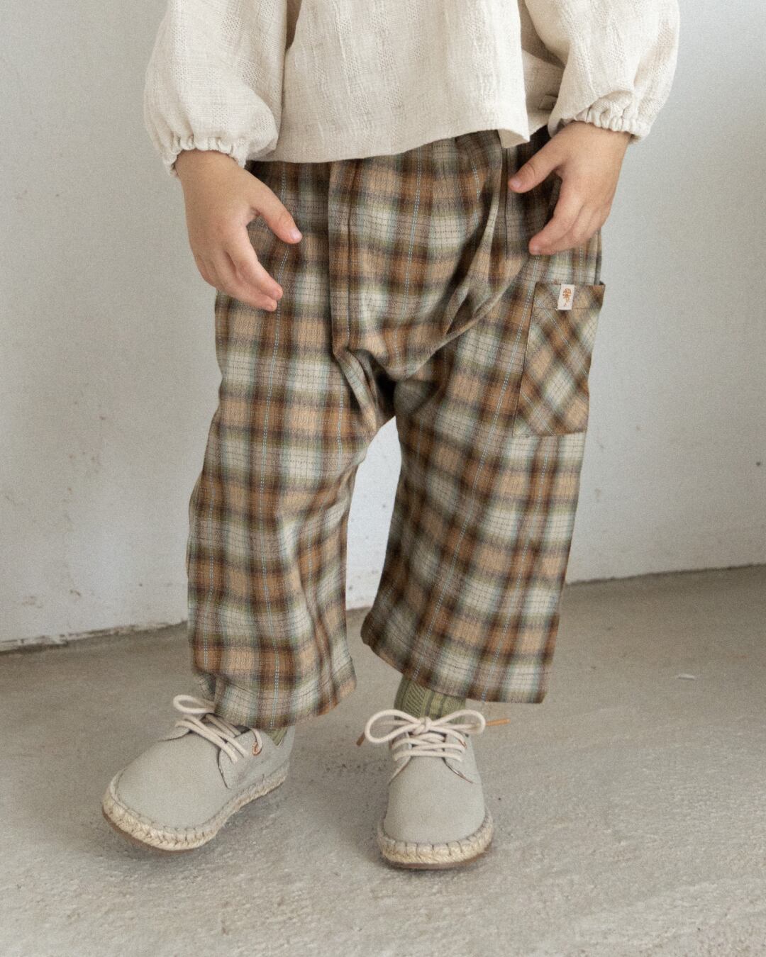 さりげない愛らしさと心地よさをあわせ持つ「フォレストチェックポケットパンツ」。