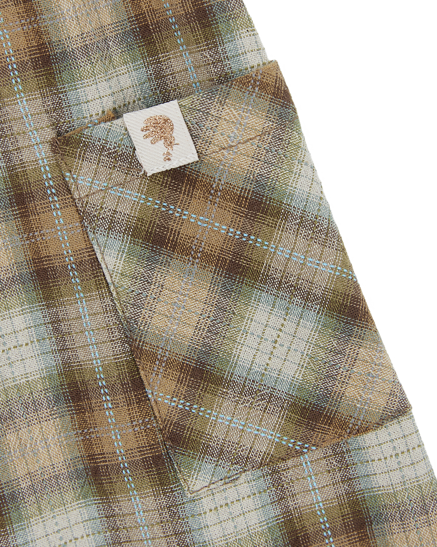 ブラウン・グリーン・ブルートーンが調和したヴィンテージチェックの生地に、