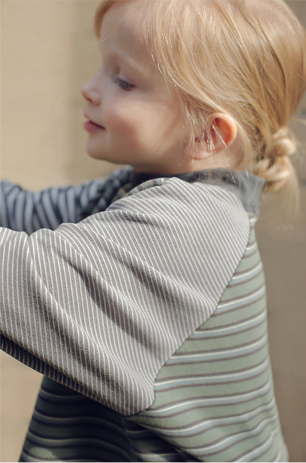 袖の切り替えデザインやライン配色など、小さなこだわりが光る1着。肩の落ちるリラックスデザインで動きやすく、お子さまが遊ぶ日にもちょうどいいバランスです。
