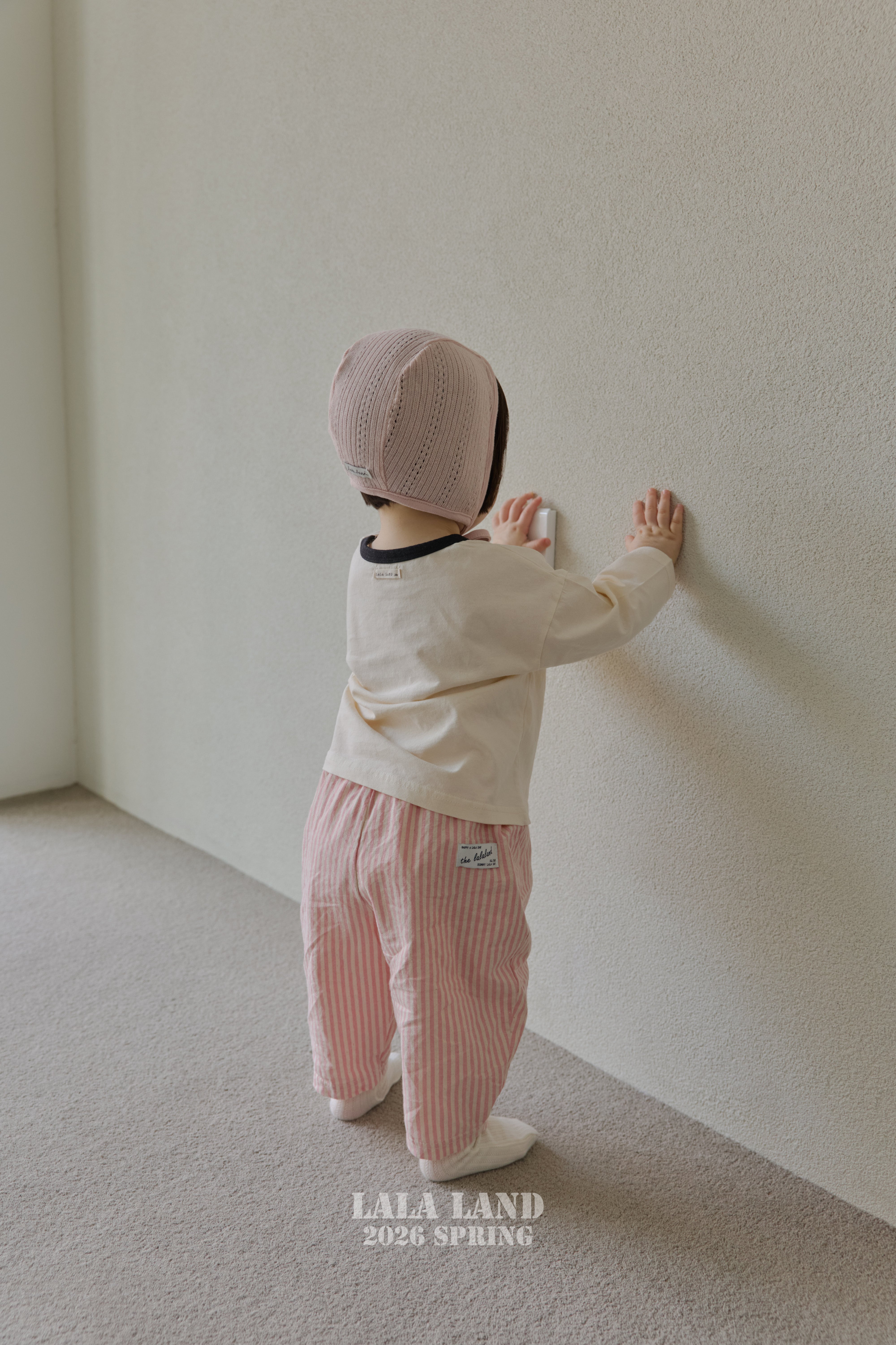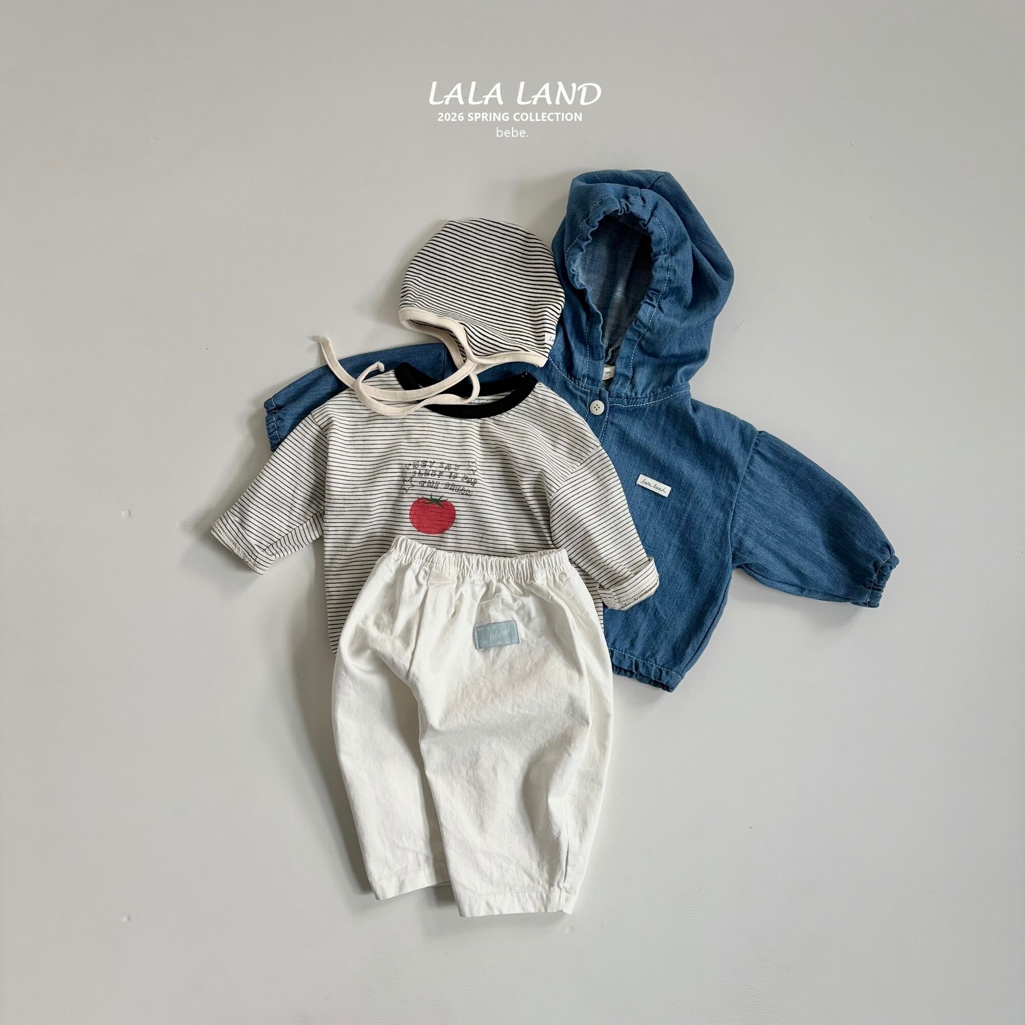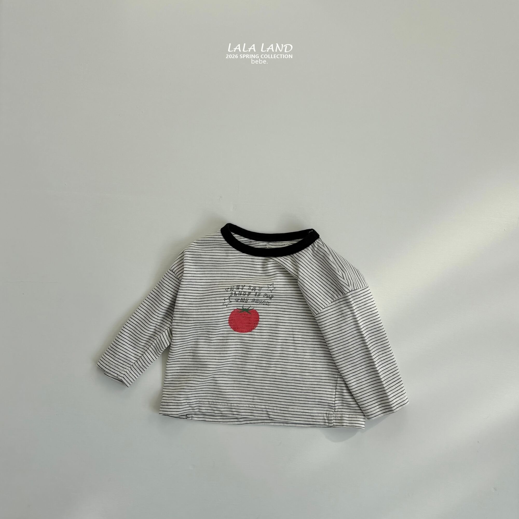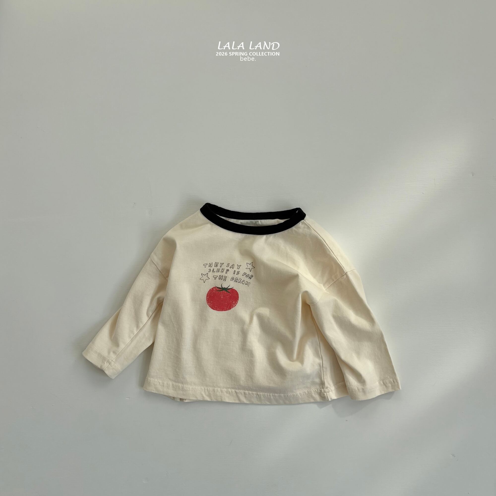 手書き風のレタリングと、ほんのりかすれたクラック加工のトマトプリントが目を惹く、ベビー用ロングTシャツ。やさしいコットン素材で、デイリー使いしやすい一枚です。