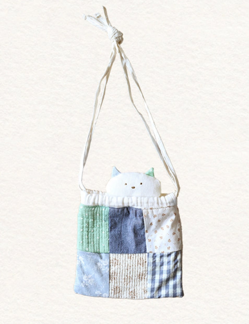 やわらかなパッチワーク生地で仕立てられた、猫モチーフのクロスバッグ。小さな猫のぬいぐるみが顔をのぞかせるデザインが可愛らしく、コーディネートのアクセントとして楽しめるアイテムです。