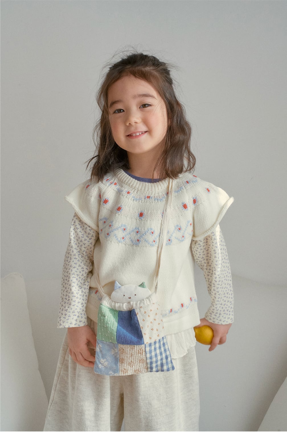 やさしい色合いの生地を組み合わせたパッチワークデザインで、ナチュラルな雰囲気に仕上げられています。軽やかな作りで、ちょっとしたお出かけやコーディネートのポイントとしても活躍します。