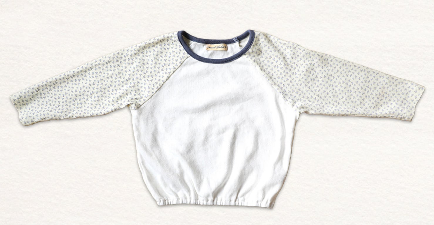 柔らかなコットン素材で仕立てられたラグランスリーブTシャツ。身頃と袖で異なる小花柄の生地を組み合わせたデザインが、さりげないアクセントになっています。