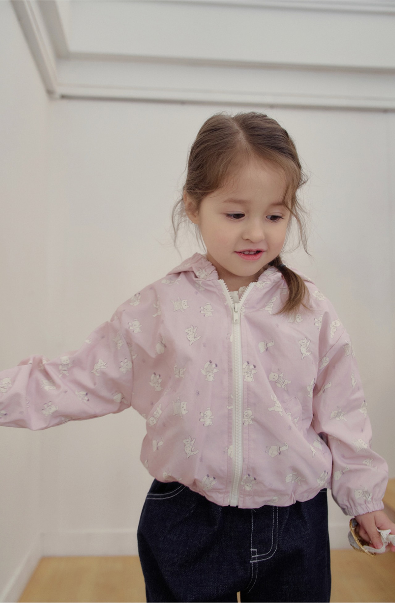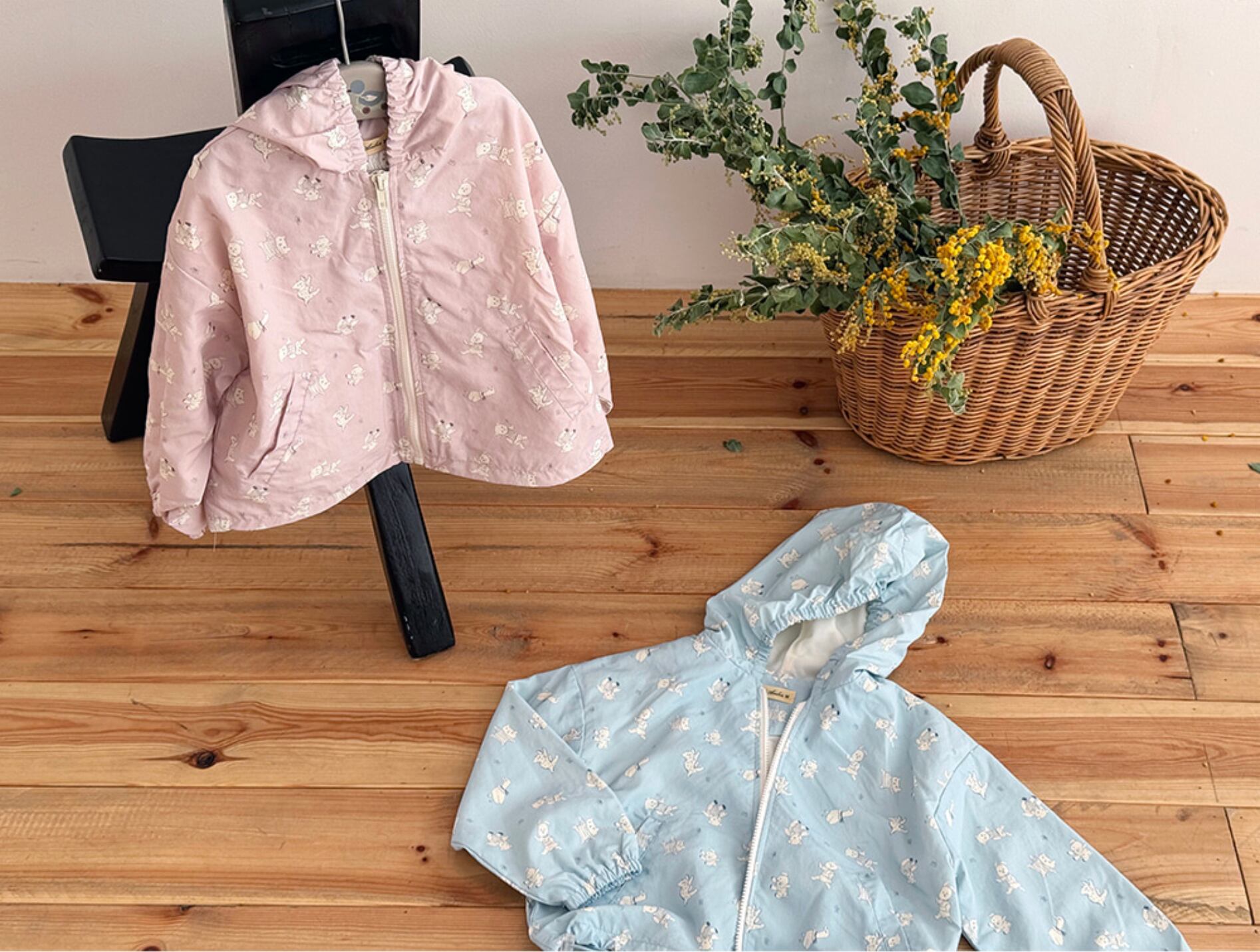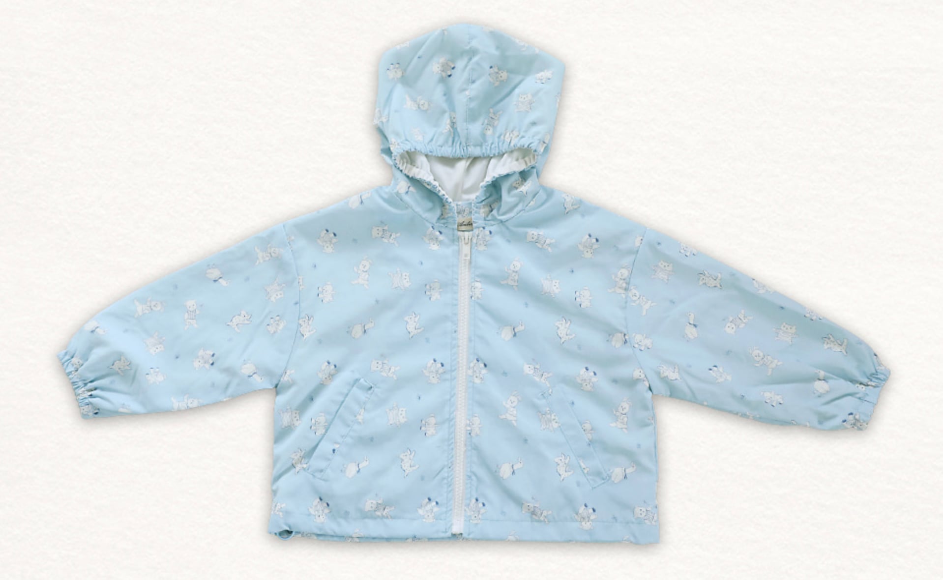軽やかなナイロン素材で仕立てられたフード付きウィンドジャケット。全面に施された愛らしいプリントが、コーディネートにやさしいアクセントを添えてくれます。