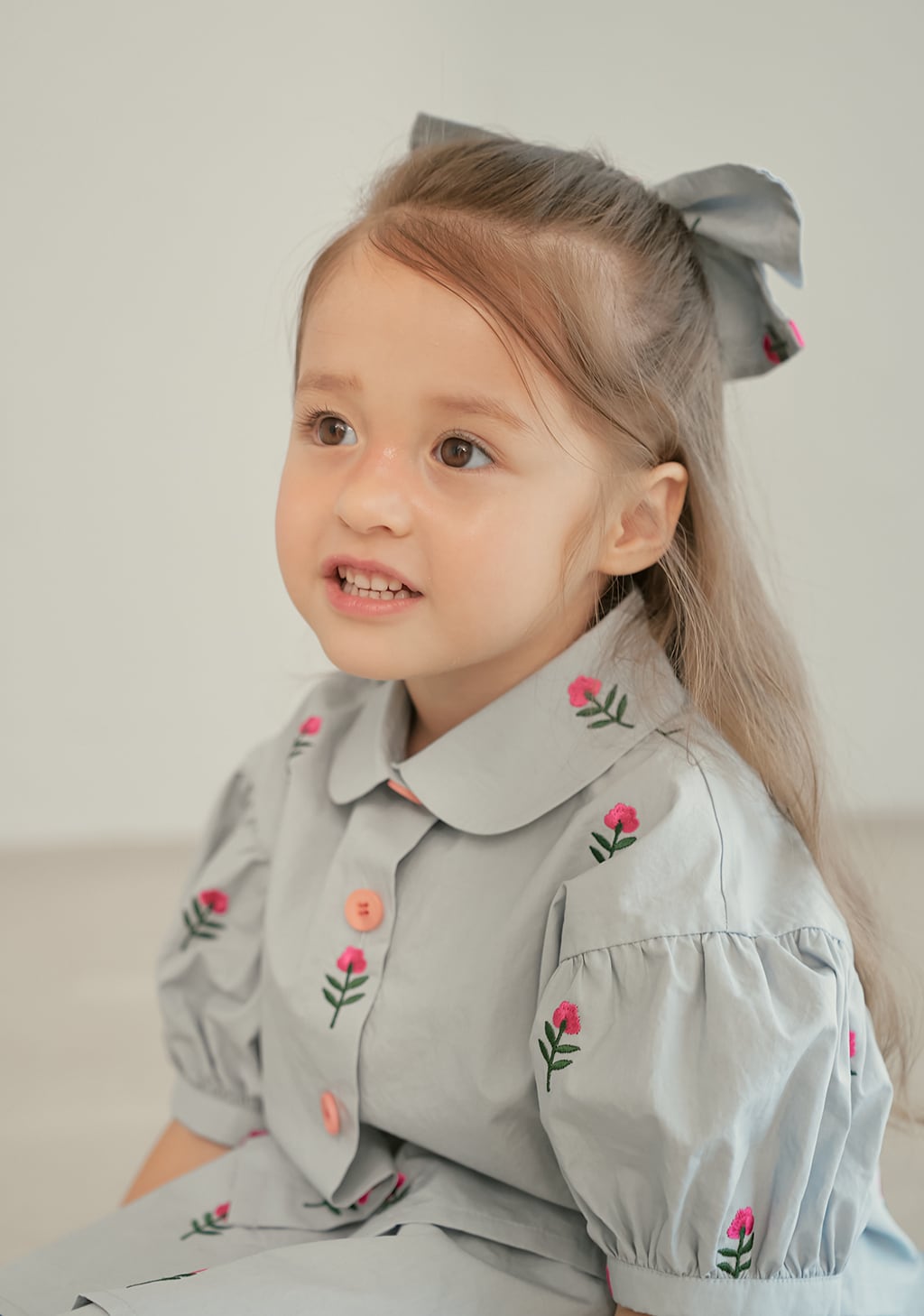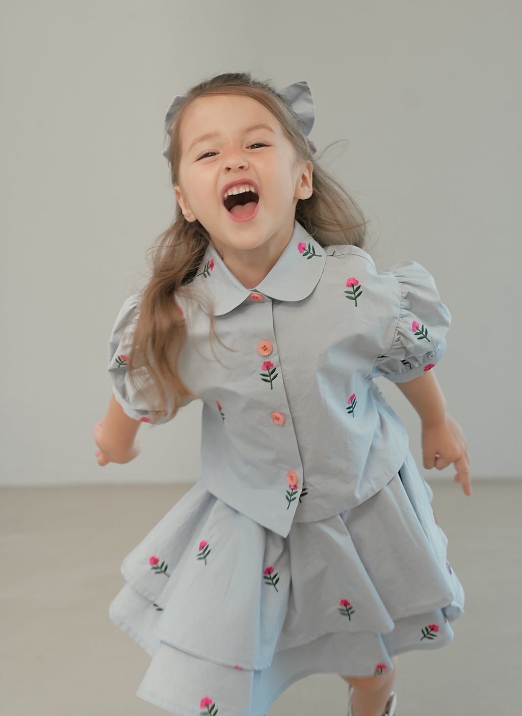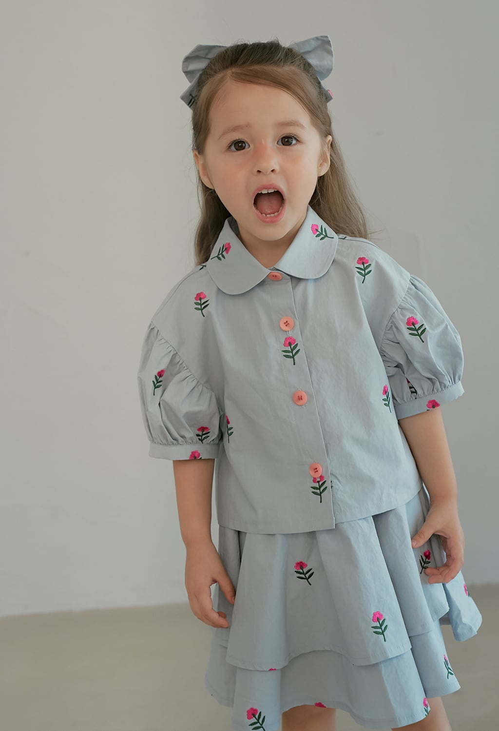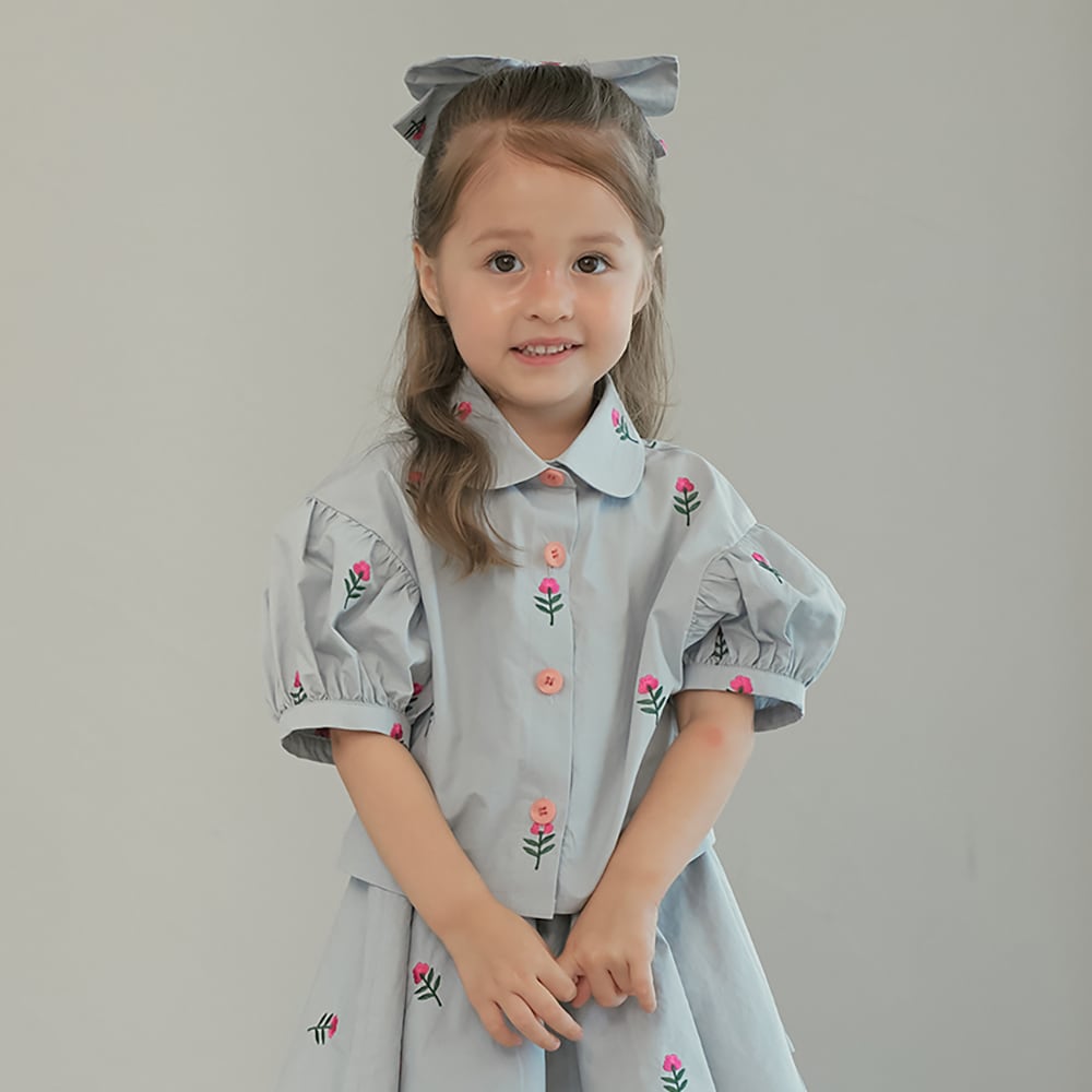 小さな花の刺繍が可愛らしいブラウス。momohanipopoらしい優しい雰囲気のデザインです。ふんわりとしたパフスリーブがポイントで、一枚で華やかなコーディネートが完成します。