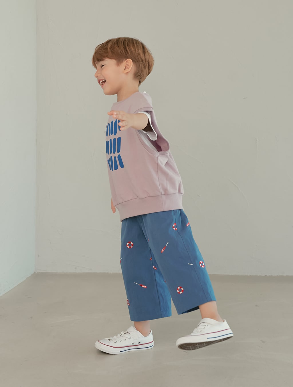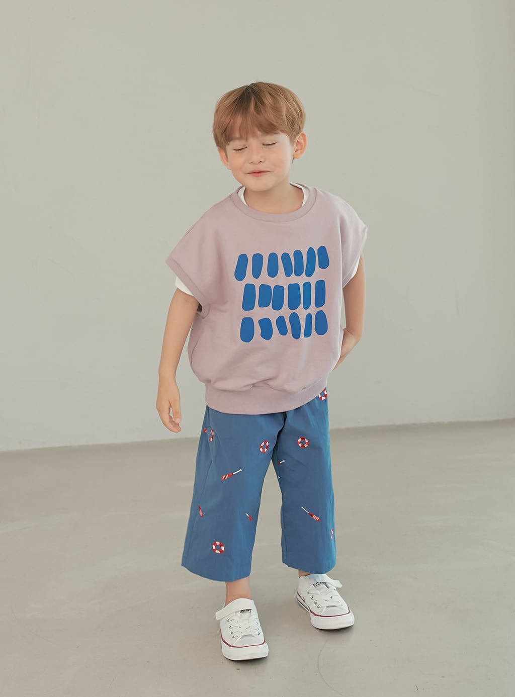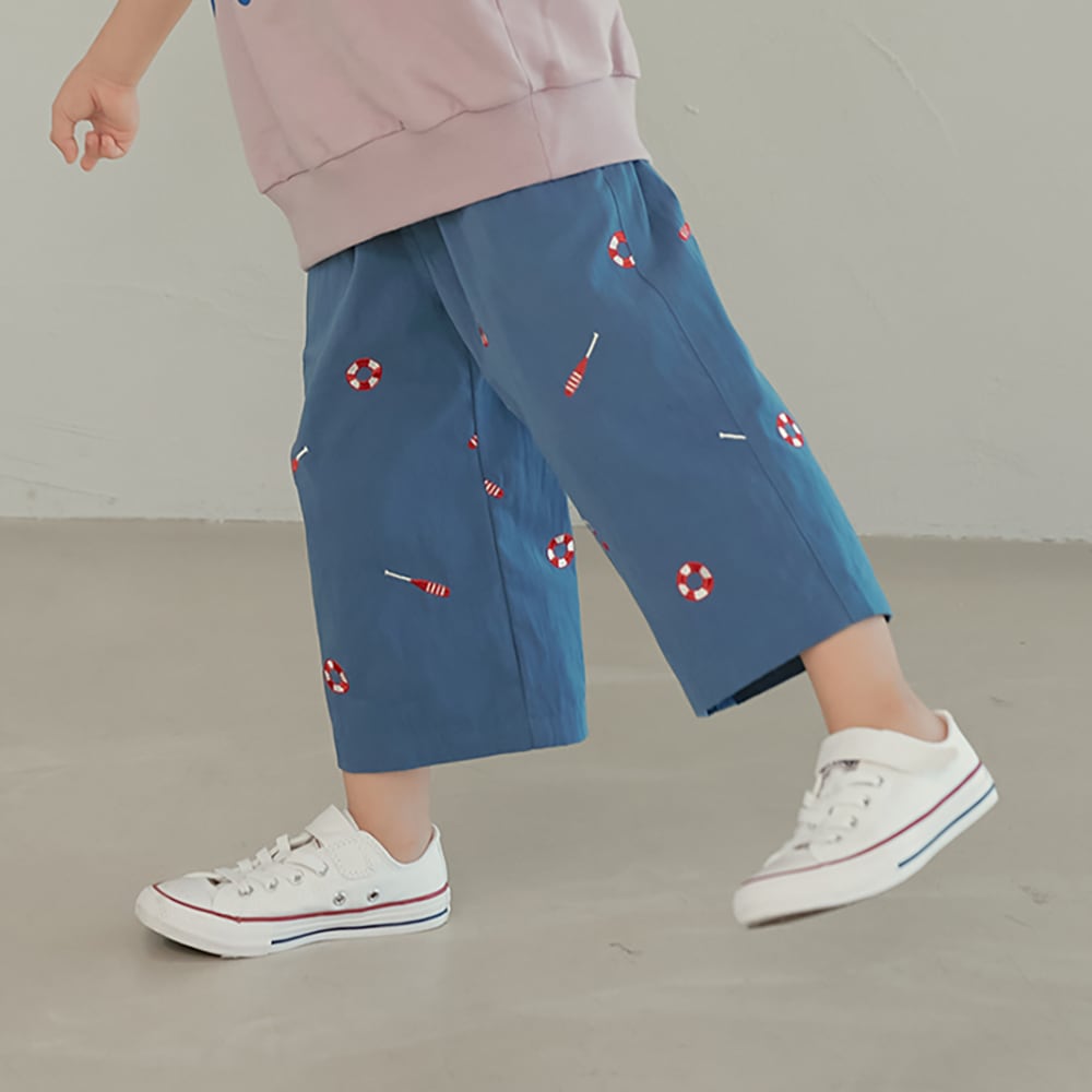 momohanipopoらしい遊び心のあるプリントが印象的なパンツ。爽やかな配色がコーディネートのアクセントになります。