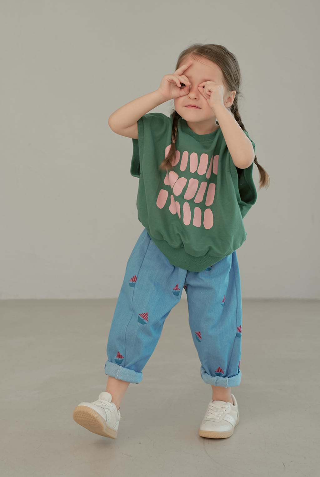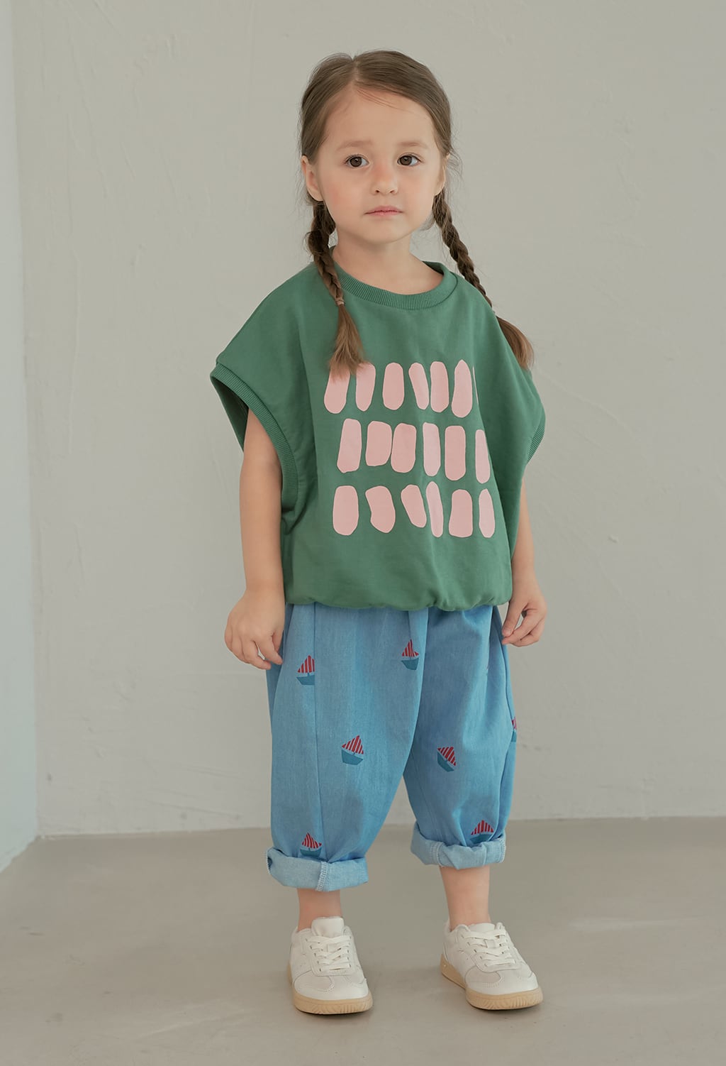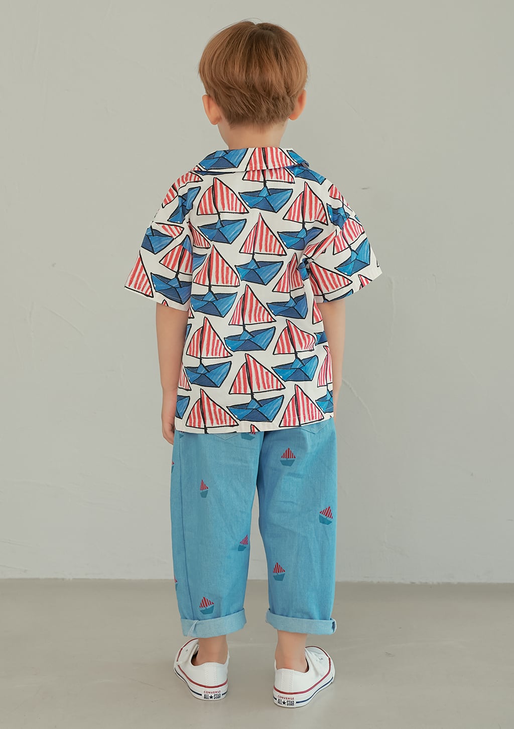 小さなボートモチーフのプリントが可愛らしいデニムパンツ。momohanipopoらしい遊び心のあるデザインです。