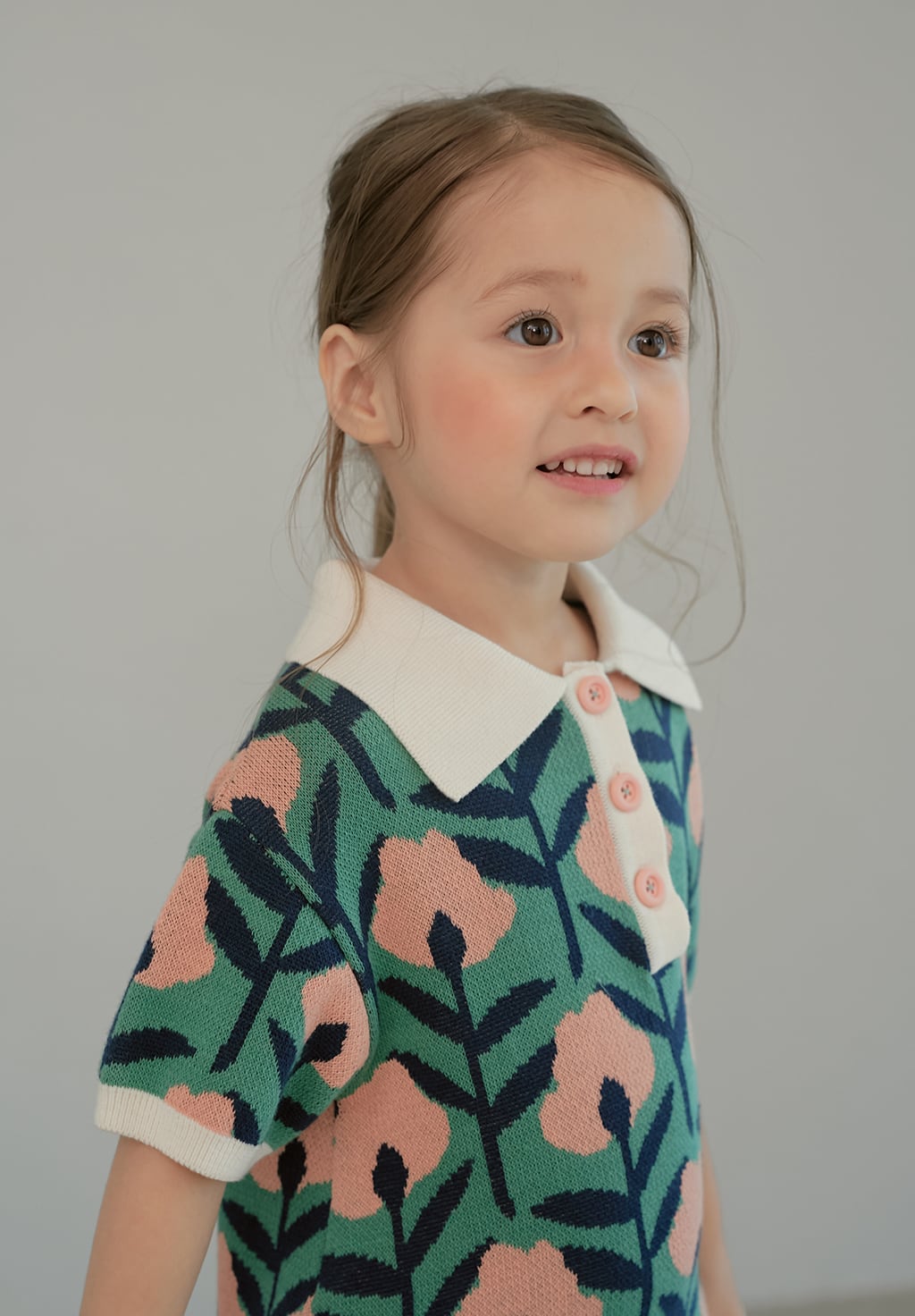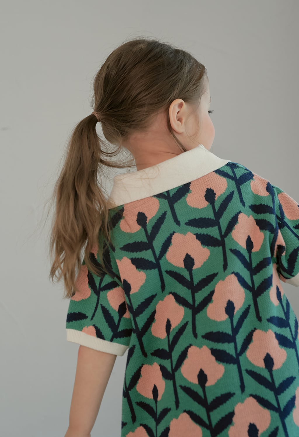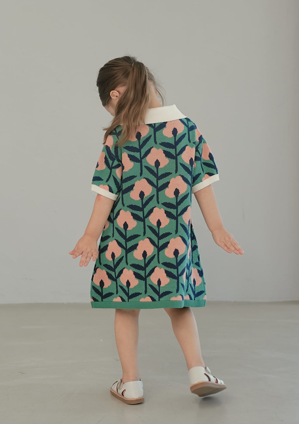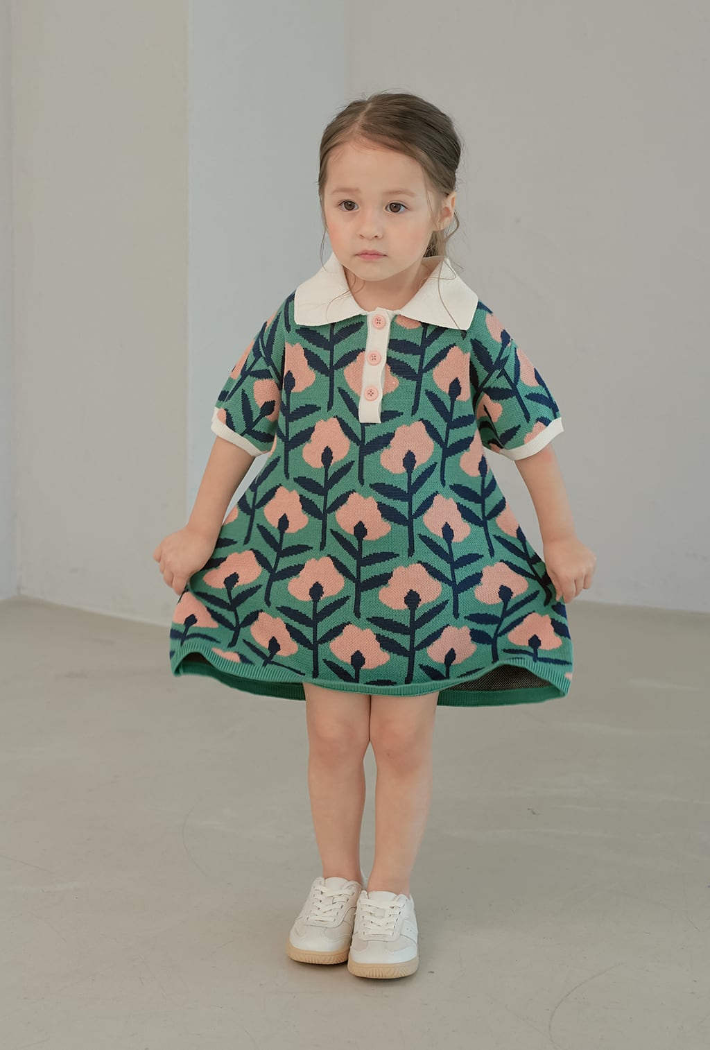 momohanipopoらしいアート感のあるフラワーパターンが印象的なニットワンピース。