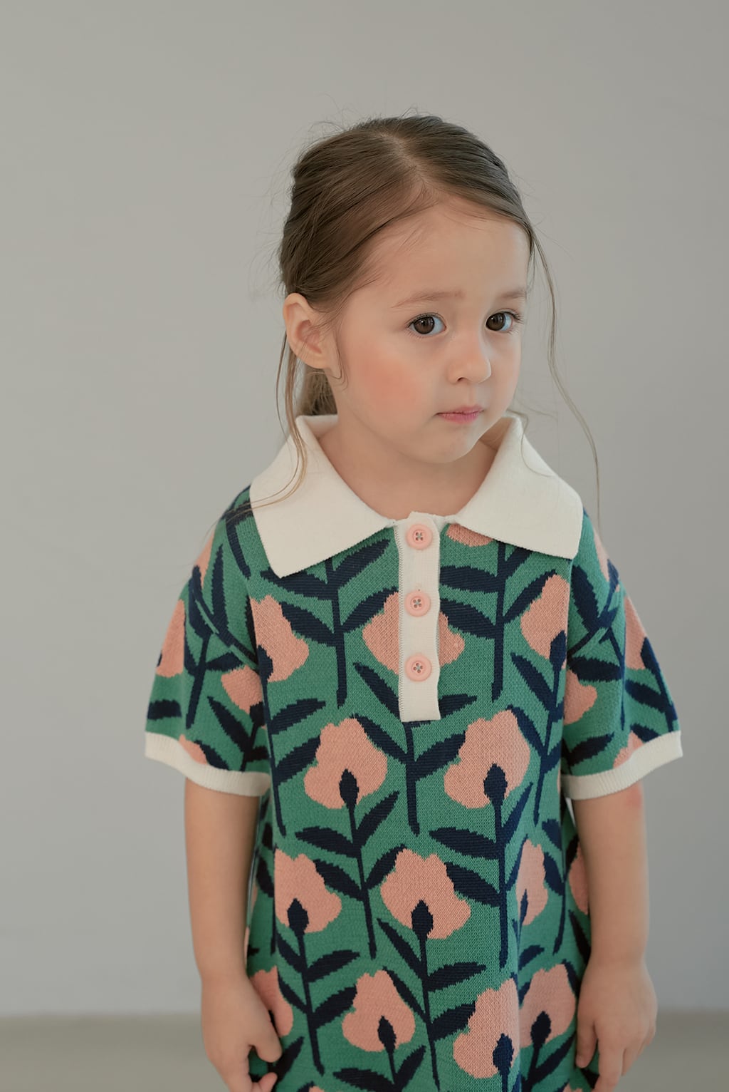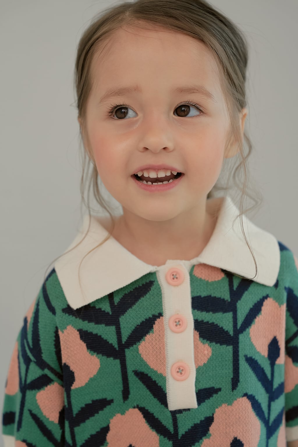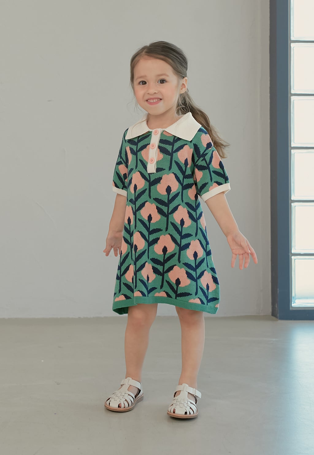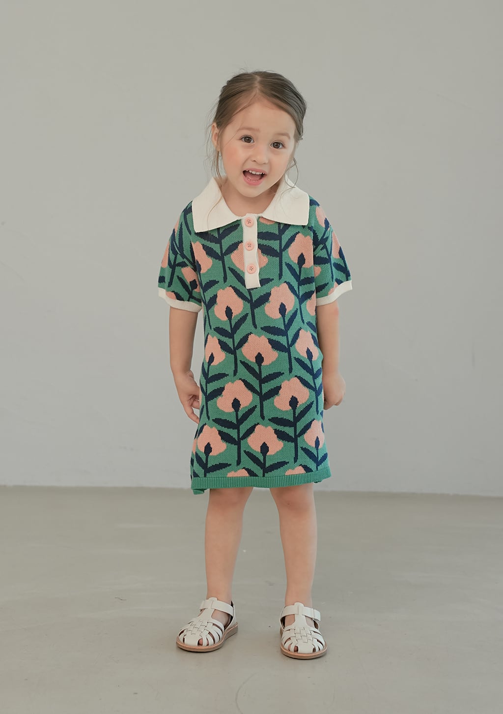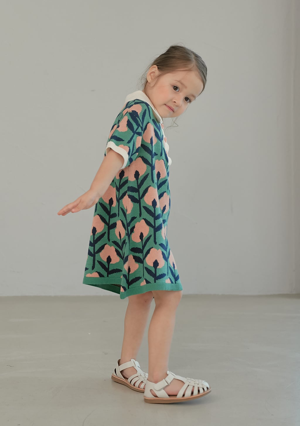 momohanipopoらしいアート感のあるフラワーパターンが印象的なニットワンピース。