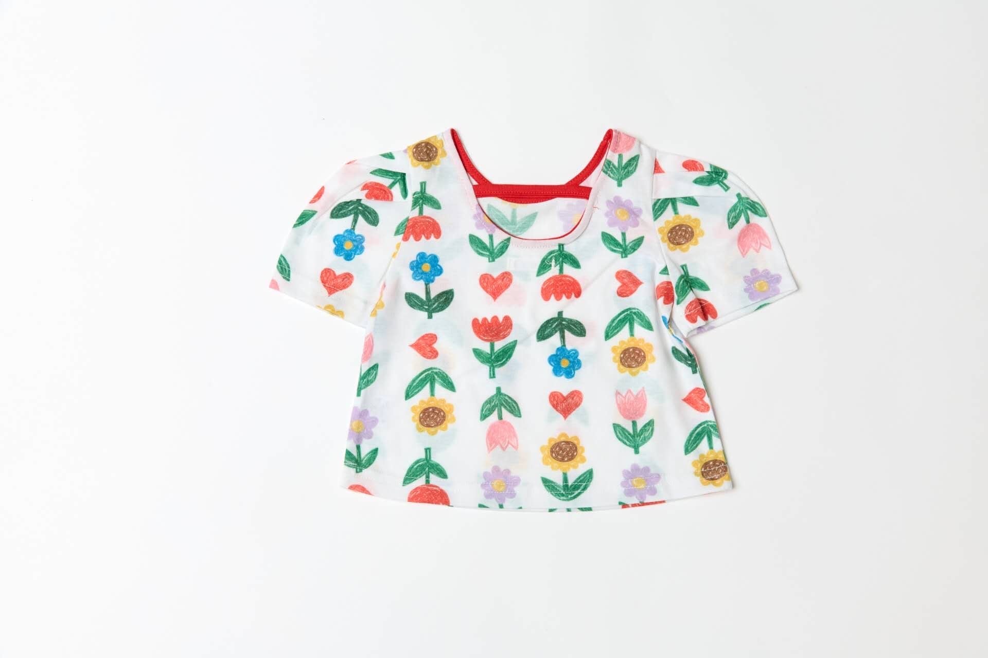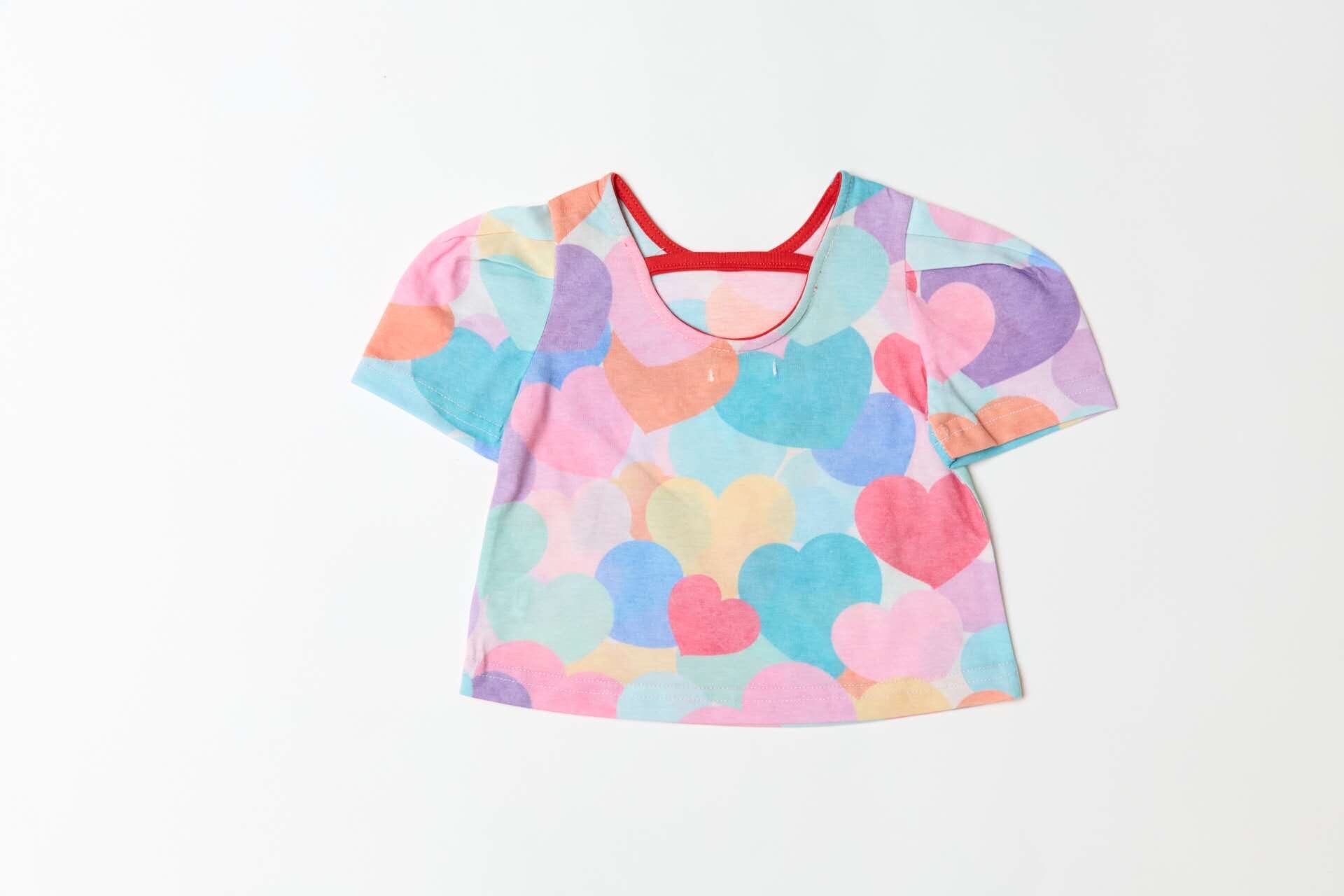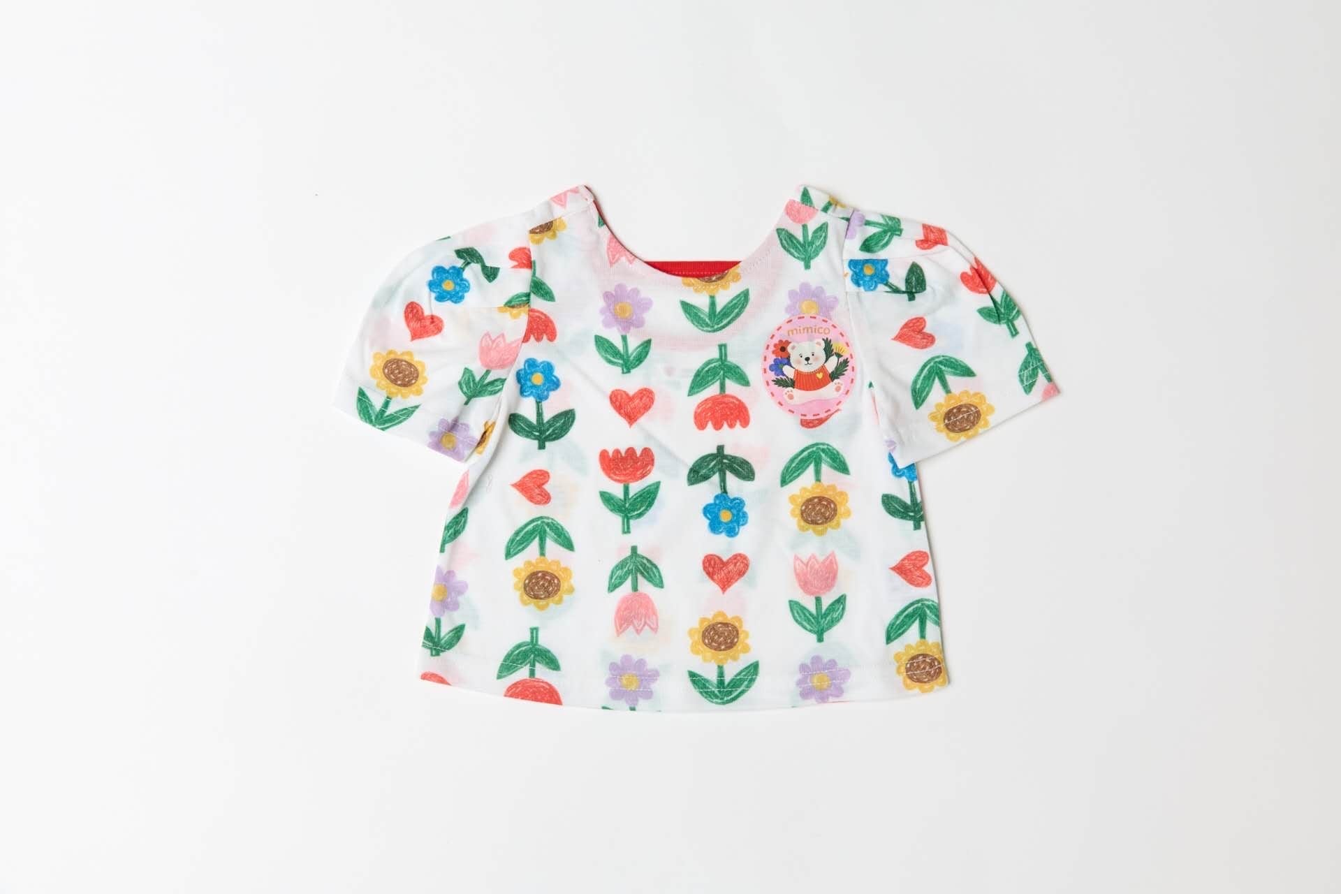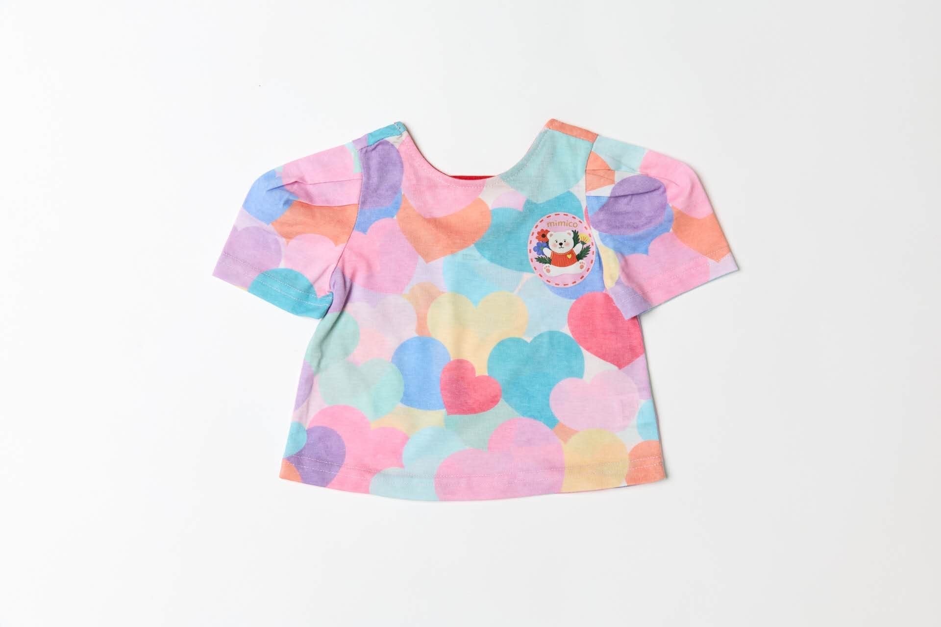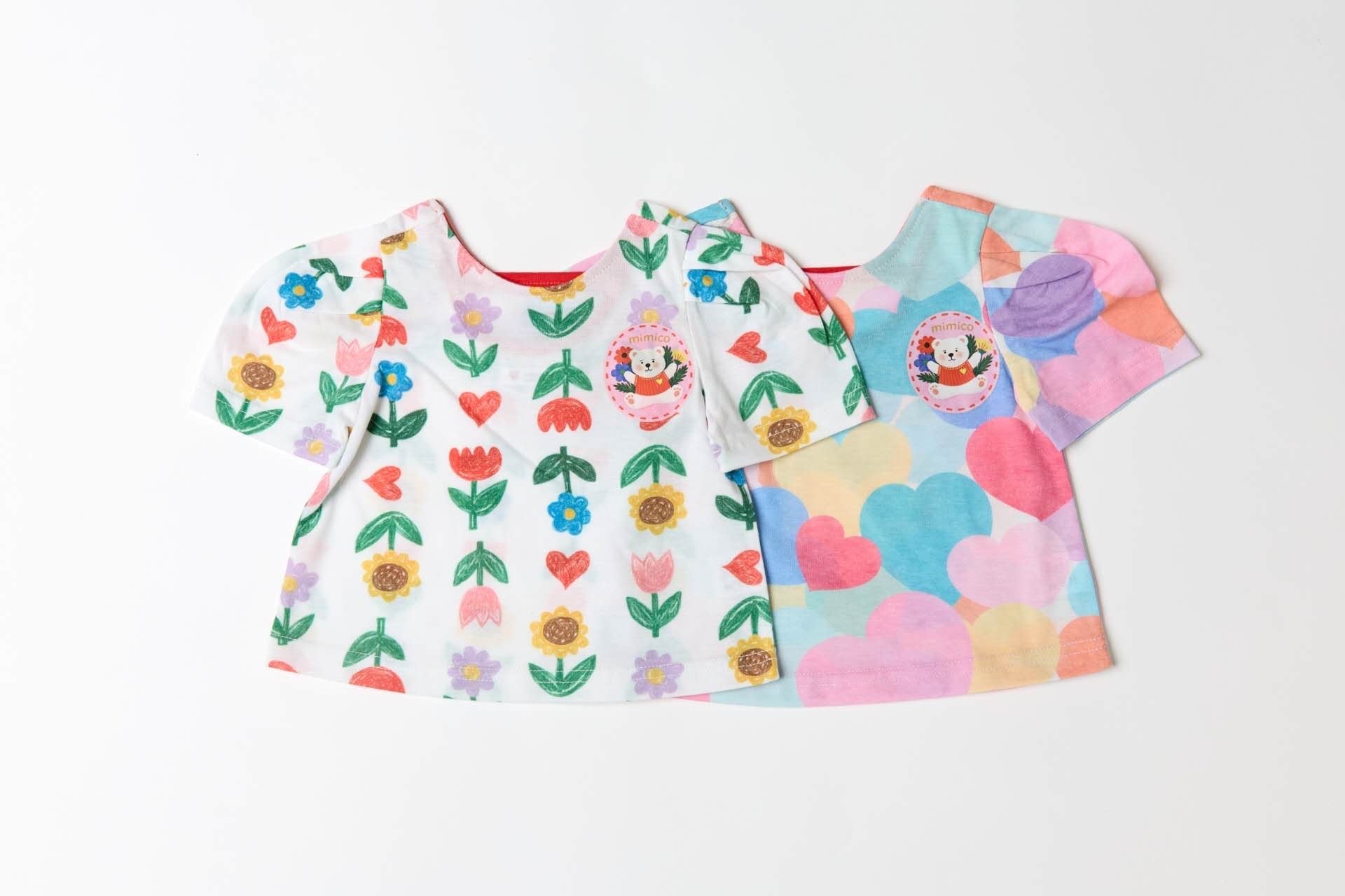 カラフルなフラワーやハート柄が全面に広がる華やかなTシャツ。