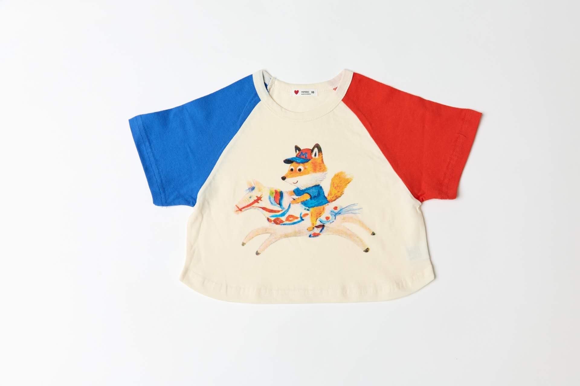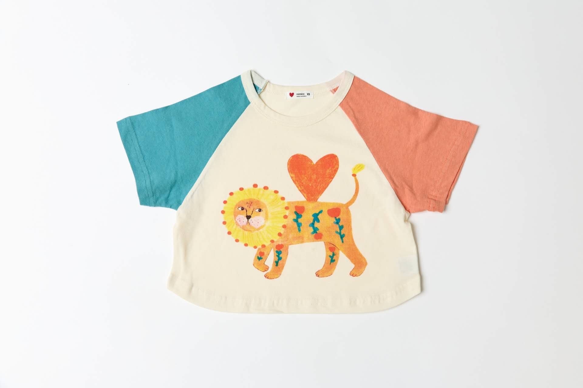 ライオンやフォックスのイラストが目を引くポップなデザインに、配色のラグランスリーブがアクセントになったTシャツ。