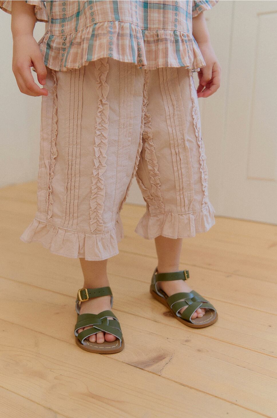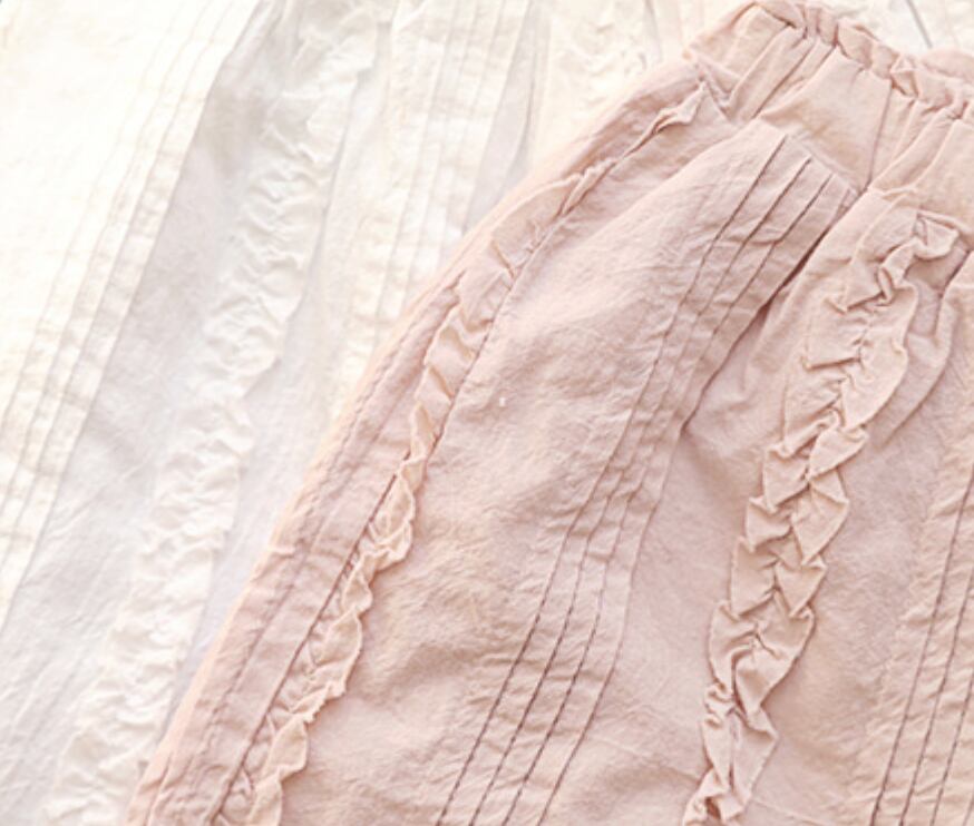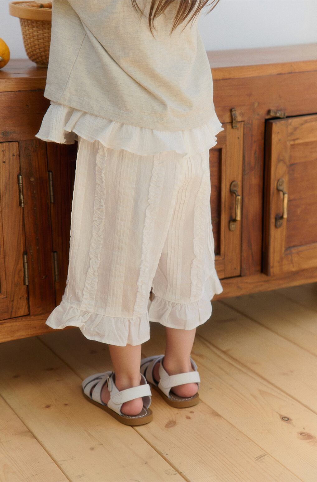 ややボリューム感のあるデザインながら、ウエストはゴム仕様でストレスフリーな履き心地。裾にかけて広がるラインと繊細なフリルが、コーディネートにやさしい存在感をプラスしてくれます。