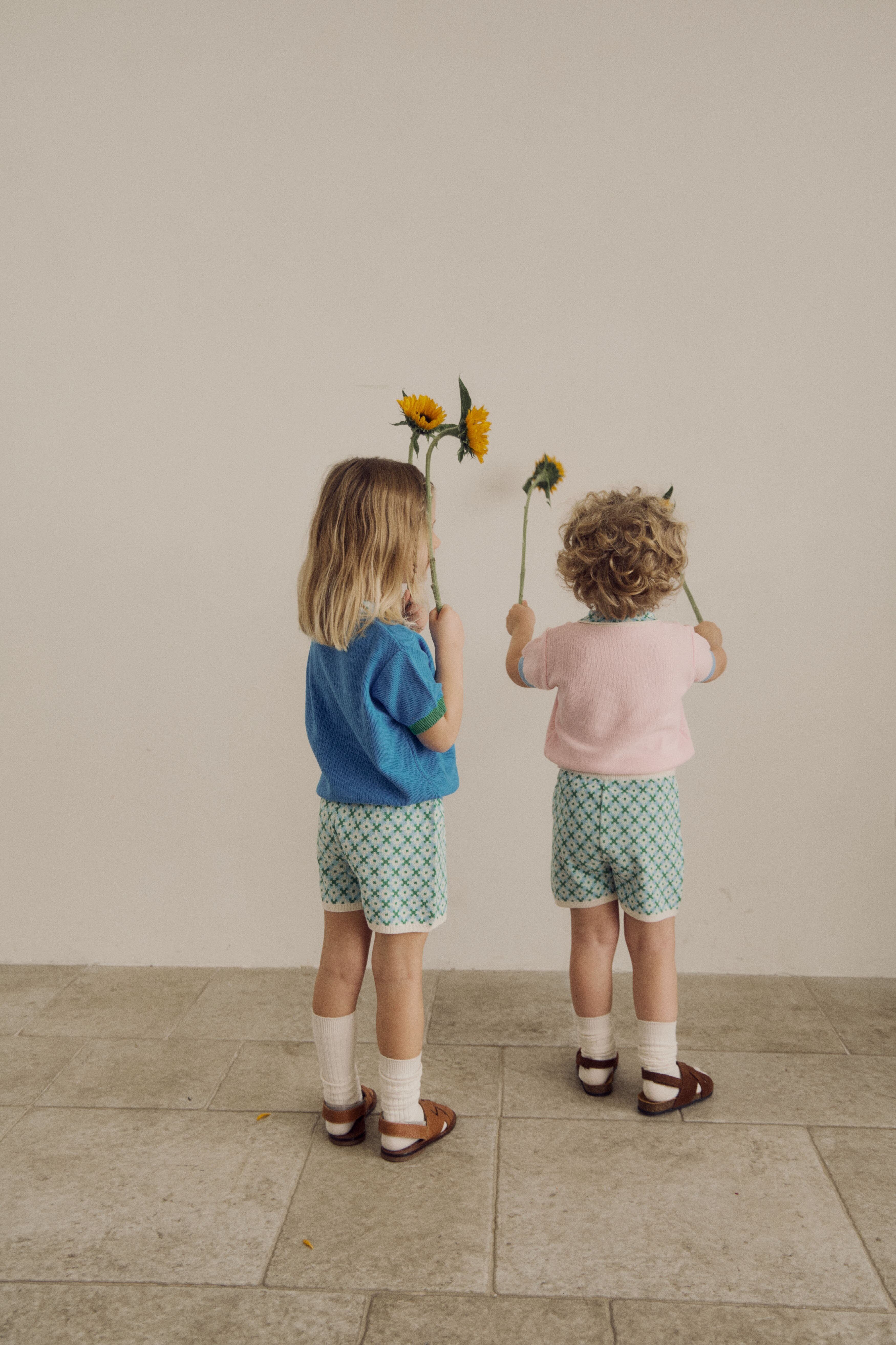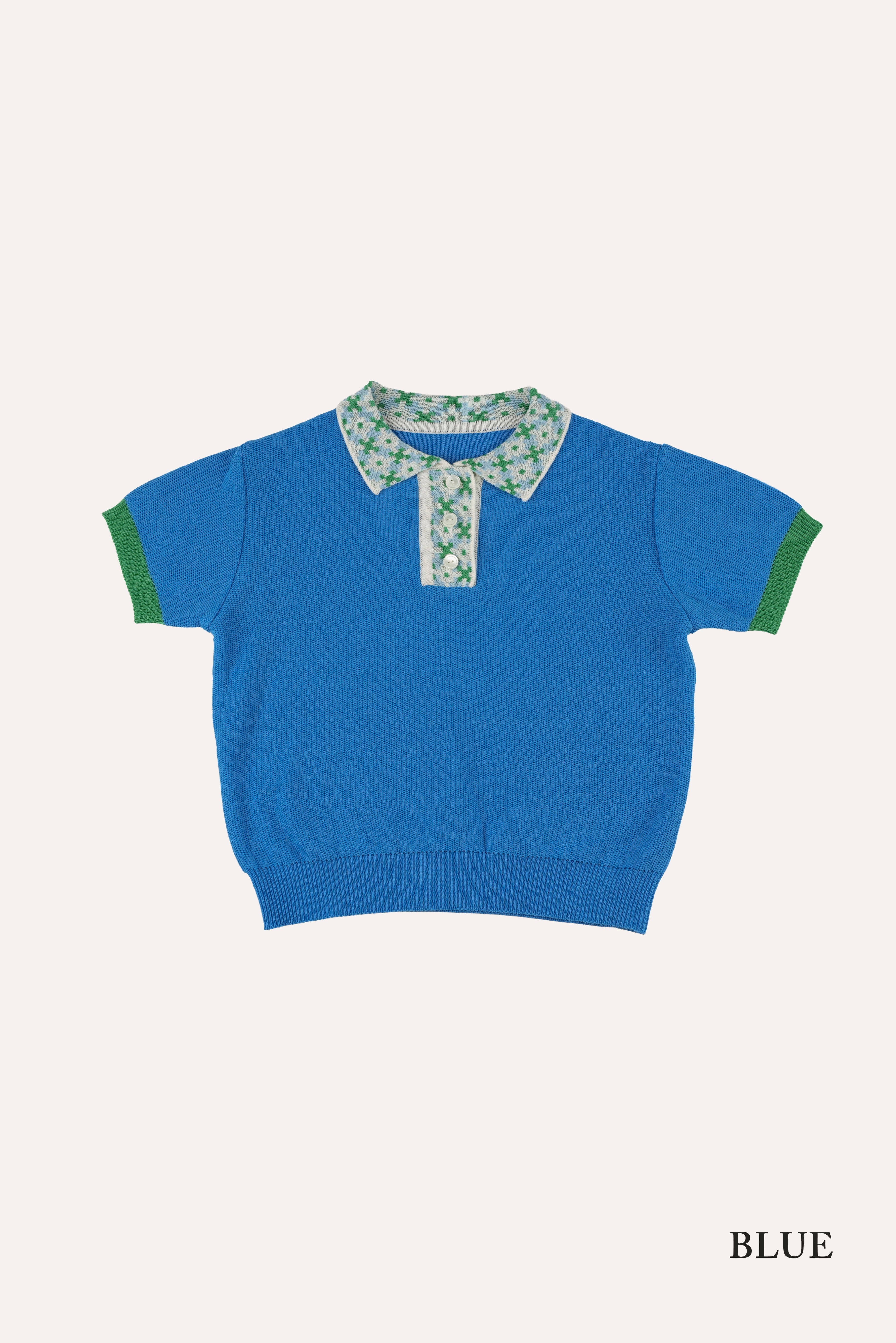 やわらかな配色とヴィンテージ感のあるディテールが魅力のサマーニット。襟元や前立てにあしらわれた柄が、コーディネートにさりげないアクセントを添えてくれます。