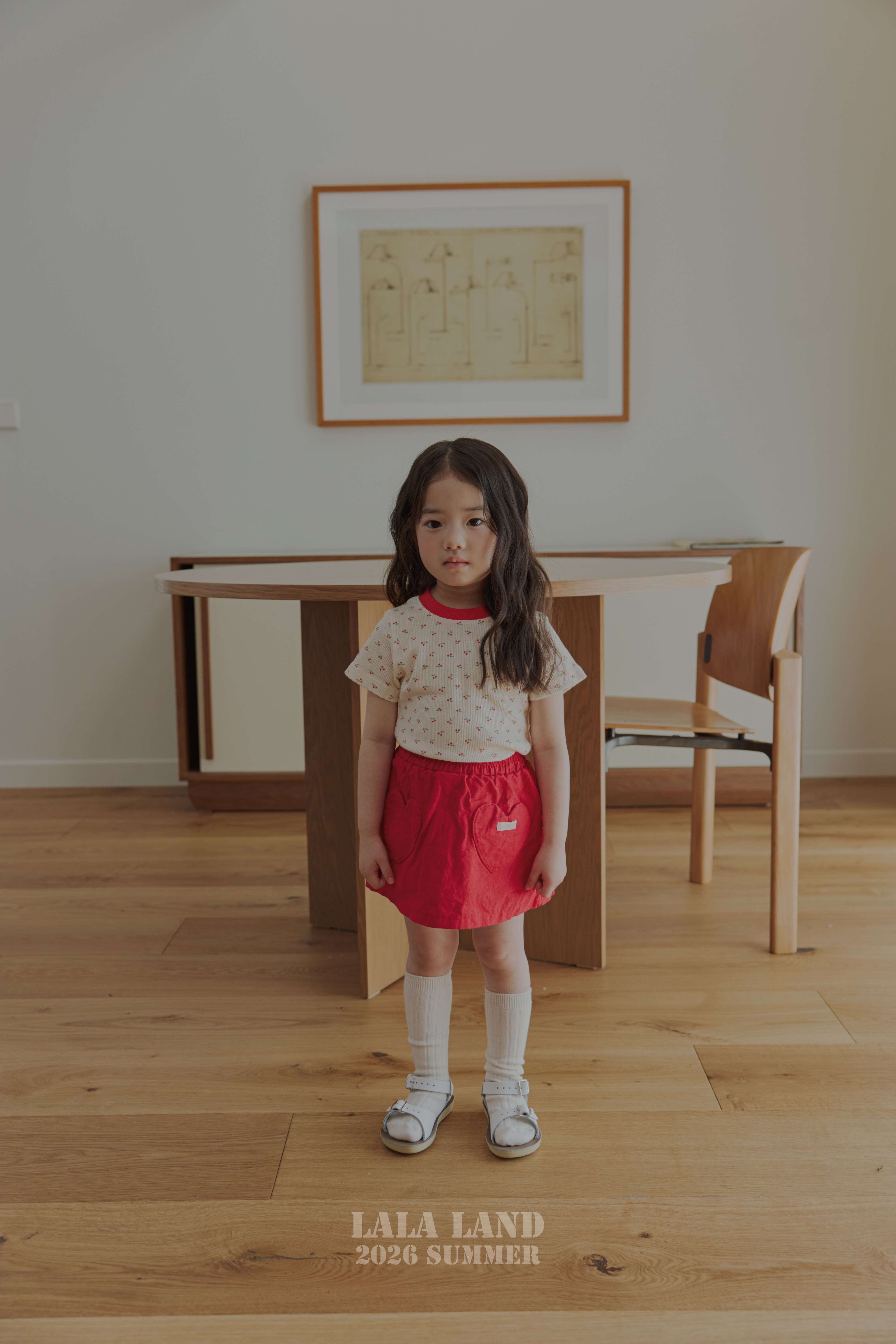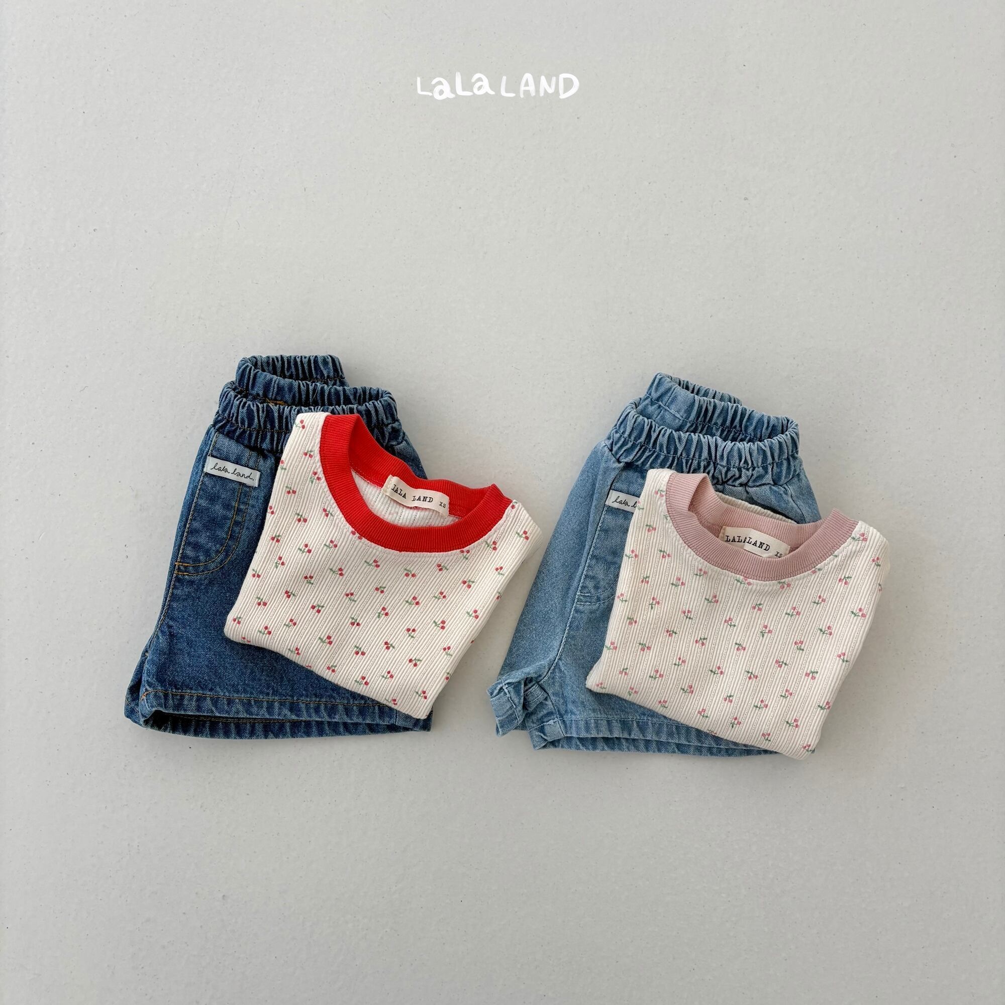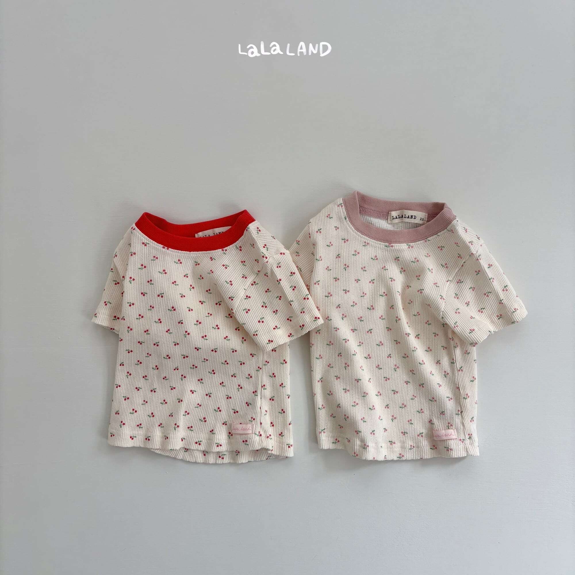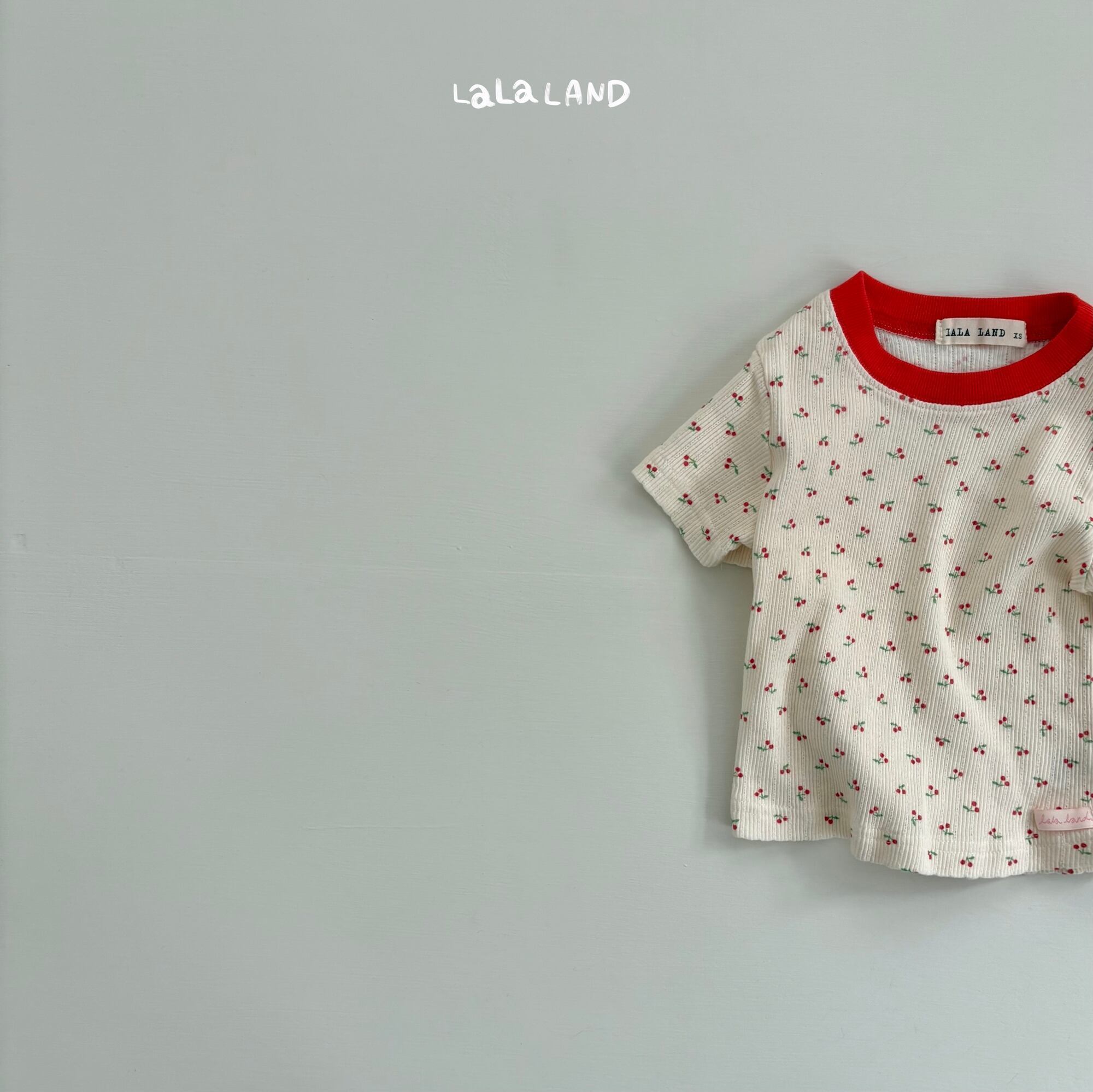 小さなチェリーが全面に散りばめられた、キュートなキッズ用半袖Tシャツ。