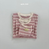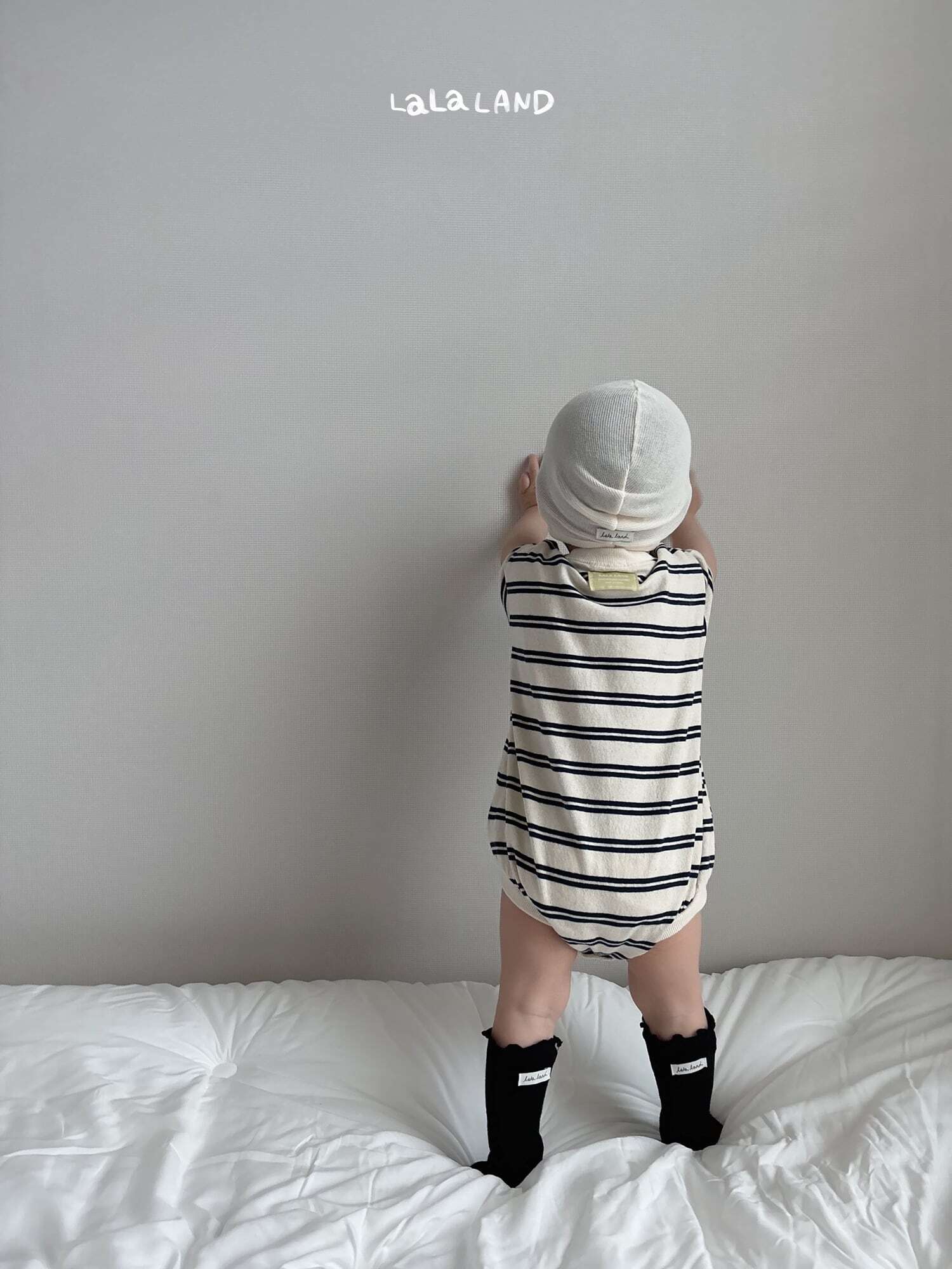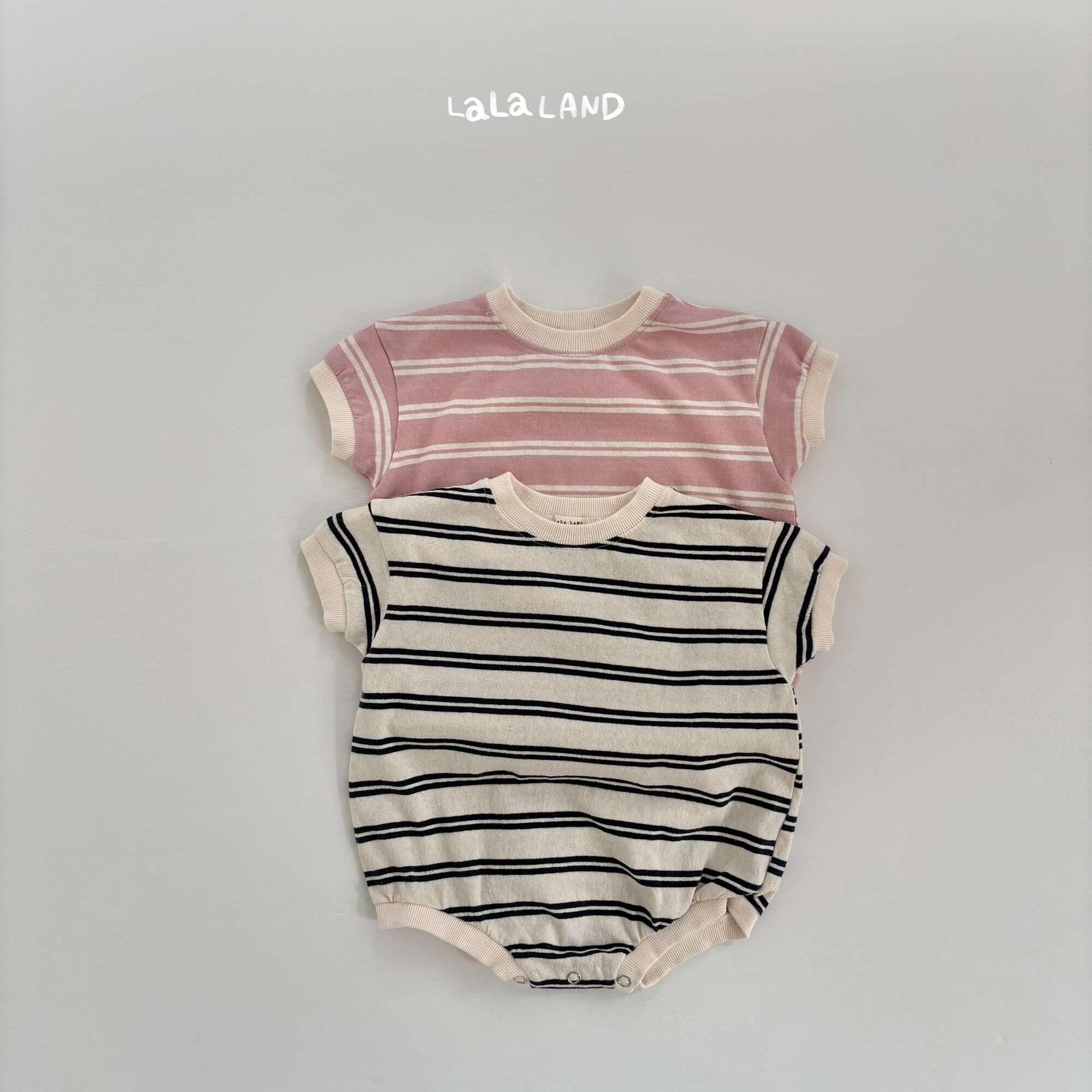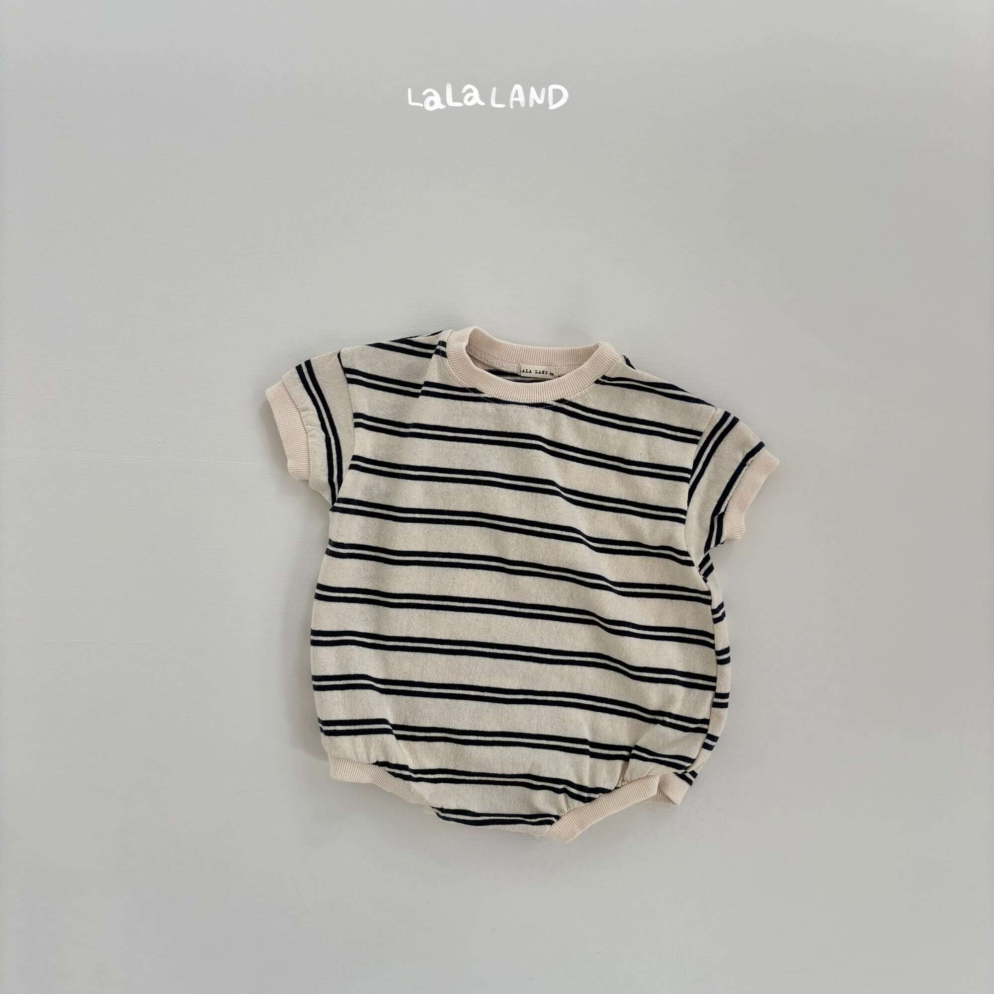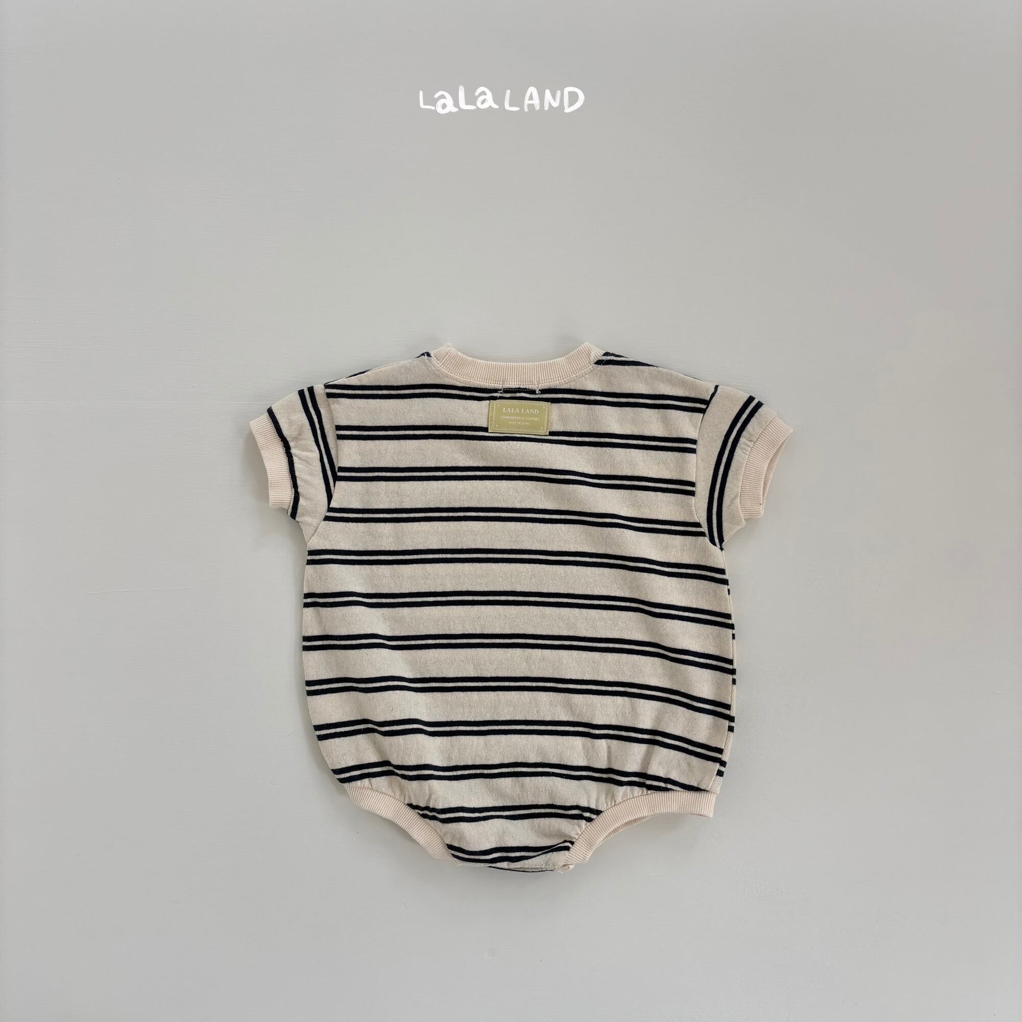 ナチュラルなカラーのボーダー柄が愛らしい、ベビー用半袖ロンパース。しっかりとした発色のストライプが全体を引き締め、シンプルながらも存在感のある一枚です。